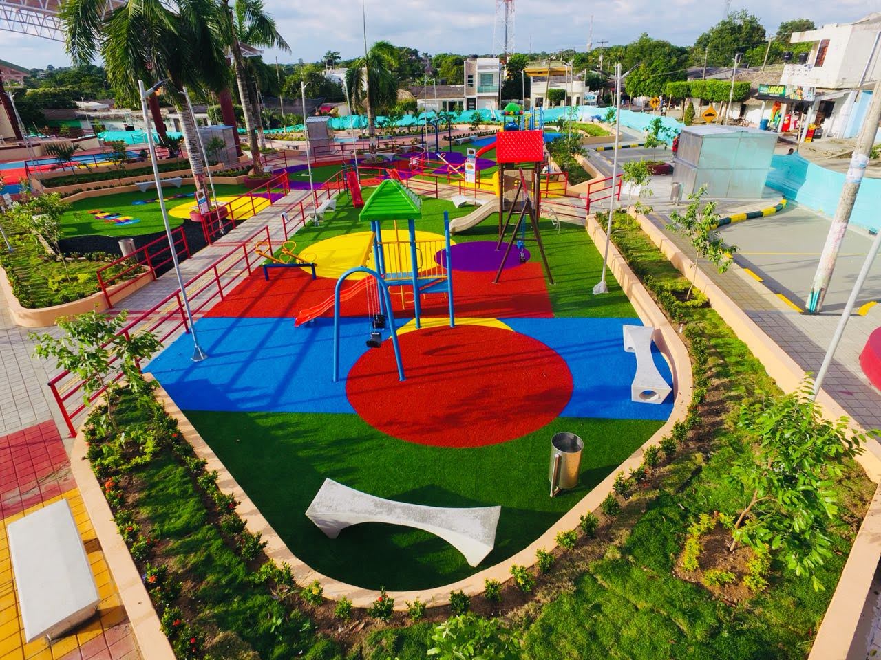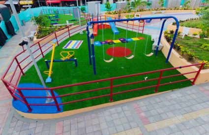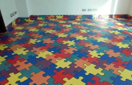 Piso en vinilo con diseño rompecabezas en zona de escolar