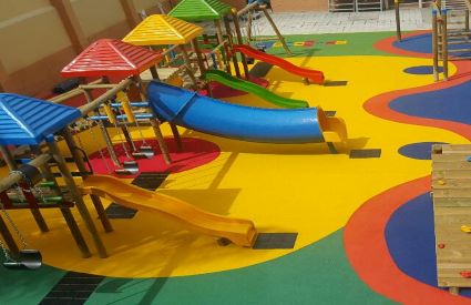 Piso en vinilo con diseño rompecabezas en zona de escolar.